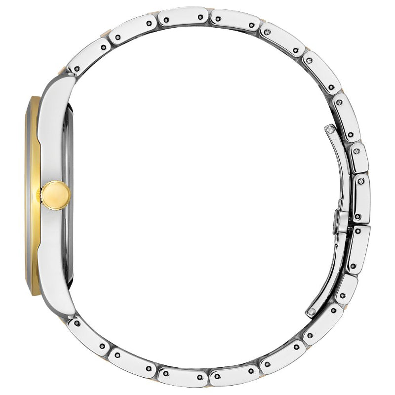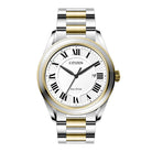 The Arezzo two-tone men's watch is a modern take on a classic style. It features a two-tone bracelet band, and is paired with a white dial and bold black roman numeral markers. The three-hand watch also shows the current date, and it is sustainably powered by light with Citizen's Eco-Drive technology. This is a perfect blend of modern style paired with classic details for a unique watch that will become a favorite in every collection.
