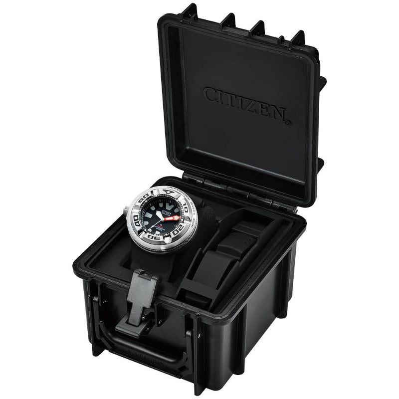 Citizen Eco-Drive Promaster Professional Diver is used for mixed gas diving with its 6mm non-reflective curved crystal, ratcheted elapsed-time bezel, screw-back case & screw-down crown, and reinforced urethane band and extender, with a carrying case for the wetsuit strap extension. Crafted in stainless steel with luminous accents, and 300M WR. Featuring our Eco-Drive technology - powered by light, any light. Never needs a battery. Caliber number B873.