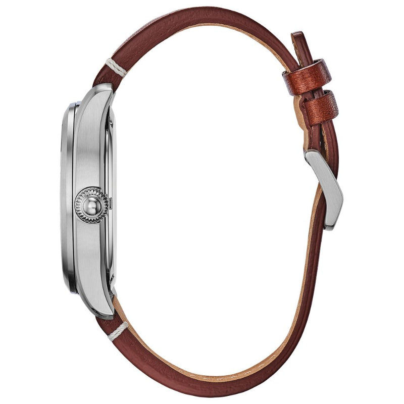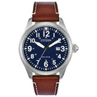 The CITIZEN Chandler Military watch, polished and comfortable, is the perfect addition to your watch collection. Featured here in a stainless steel case, camel colored strap with navy blue dial and date. Featuring our Eco-Drive technology - powered by light, any light. Never needs a battery. Caliber number E111.