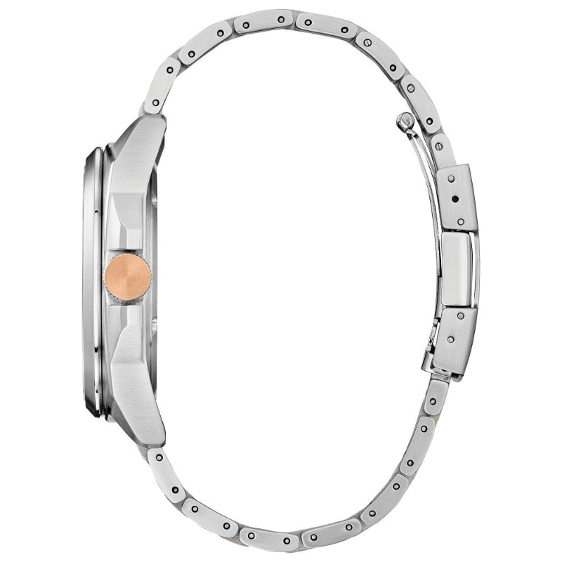 Show you mean business with this stylish men's dress watch from the Sport Luxury collection. This striking two-tone timepiece effortlessly combines classic design with contemporary styling and features a silver-tone stainless steel case with a blue 3-hand dial with date, rose gold-tone accents, and a sapphire crystal. The two-tone stainless steel bracelet features a fold-over clasp with push buttons for easy accessibility. Water-resistant up to 100 meters and featuring Citizen's sustainable Eco-Drive technology powered by any light that never needs a battery, this refined watch transitions seamlessly from day into evening with style.