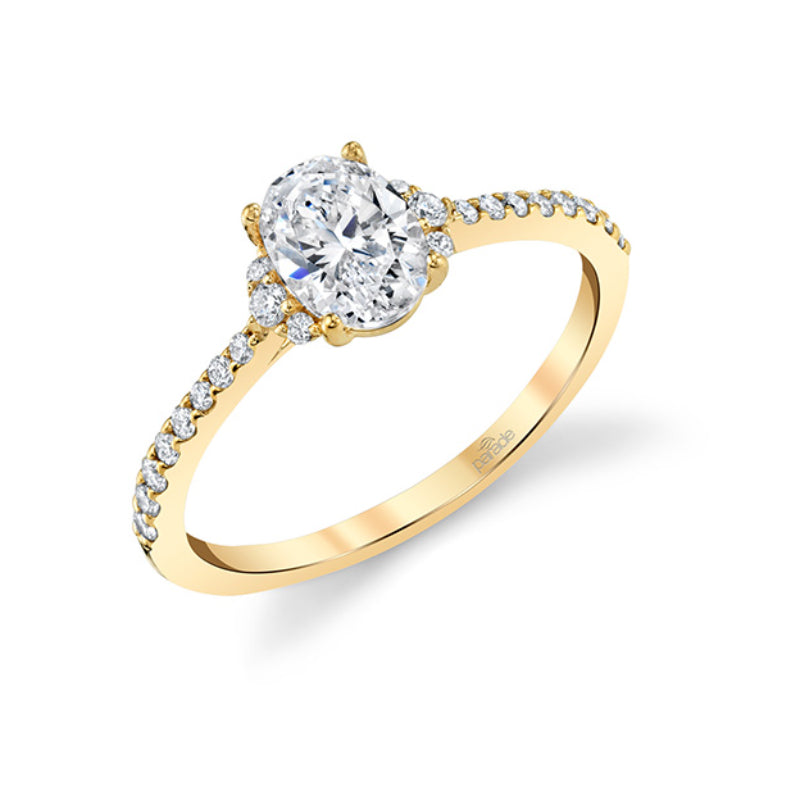 An oval brilliant center is accented with vertically set graduated diamonds on either side as well as halfway along the shank for an updated effect on a timeless piece. Stone Information: 22-RD 0.20, 02-TD 0.05. Available in Platinum, as well as 18K White, Yellow or Rose Gold.