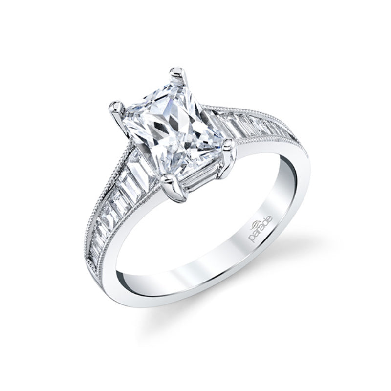 This classic design features a stream of ascending baguette diamonds that leads to an octagonal beauty. Stone Information: 16-BD 0.65. Available in Platinum, as well as 18K White, Yellow or Rose Gold.