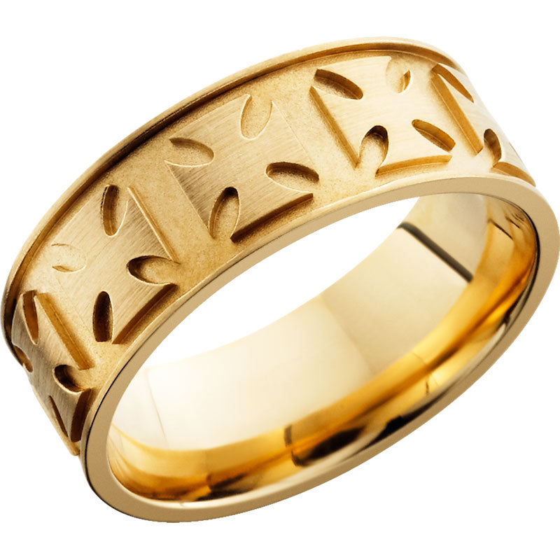 14K Yellow gold 8mm flat band with a laser-carved maltese pattern. This beautiful product isn't always in stock. Our online inventory shows everything that we produce and some products need to be made from scratch along with vendor items that we don't produce. We will call or email letting you know if the piece is available or needs to be built along with if the product needs to be sized. Current estimated build times are between 6-8 weeks.