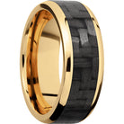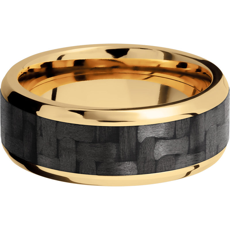 14K Yellow Gold 8mm beveled band with a 5mm inlay of black Carbon Fiber. This beautiful product isn't always in stock. Our online inventory shows everything that we produce and some products need to be made from scratch along with vendor items that we don't produce. We will call or email letting you know if the piece is available or needs to be built along with if the product needs to be sized. Current estimated build times are between 6-8 weeks.