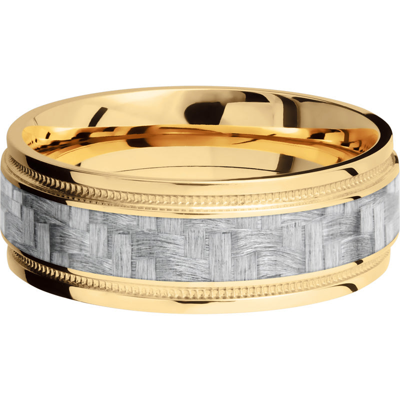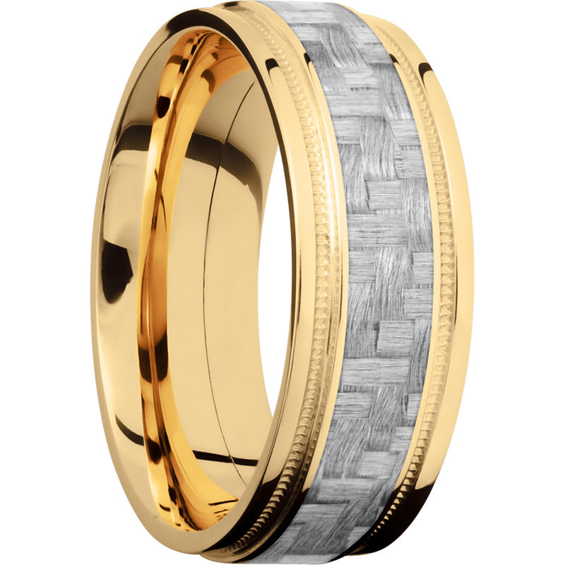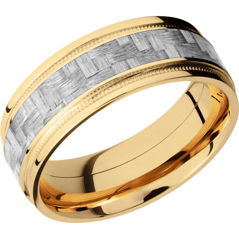 14K Yellow Gold 8mm flat band with grooved edges and a 4mm inlay of black Carbon Fiber inside reverse milgrain detail. This beautiful product isn't always in stock. Our online inventory shows everything that we produce and some products need to be made from scratch along with vendor items that we don't produce. We will call or email letting you know if the piece is available or needs to be built along with if the product needs to be sized. Current estimated build times are between 6-8 weeks.