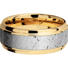 14K Yellow gold 9mm beveled band with an inlay of authentic Gibeon Meteorite. This beautiful product isn't always in stock. Our online inventory shows everything that we produce and some products need to be made from scratch along with vendor items that we don't produce. We will call or email letting you know if the piece is available or needs to be built along with if the product needs to be sized. Current estimated build times are between 6-8 weeks.