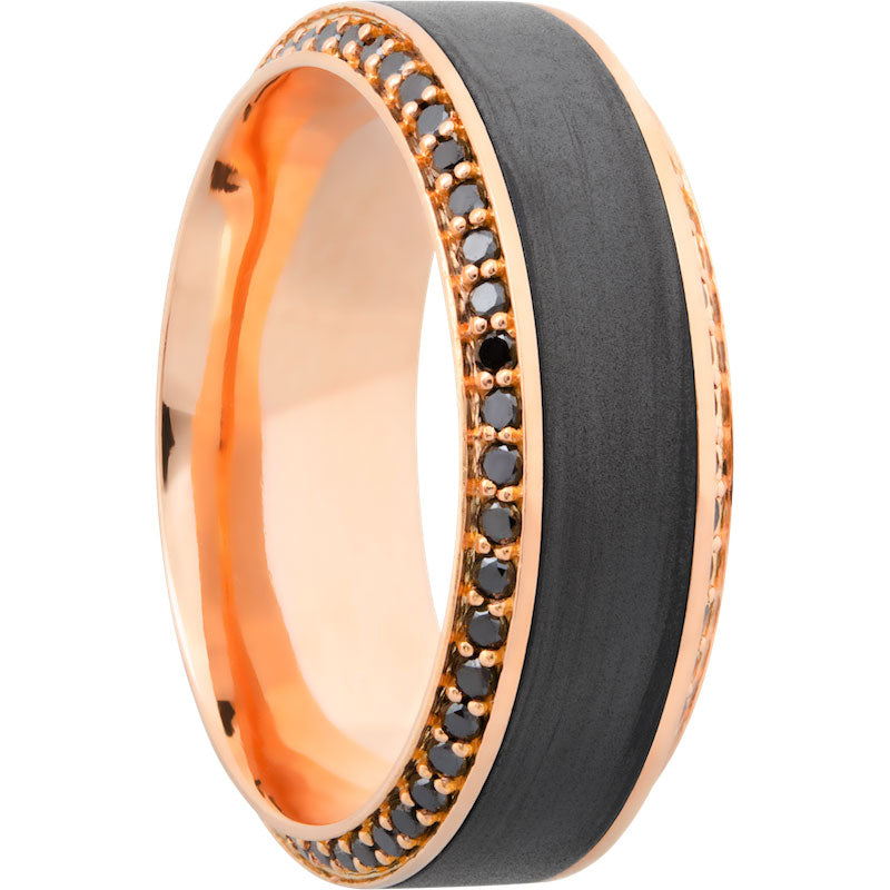 18K Rose gold 8.5mm beveled band with an inlay of zirconium and bead-set eternity black diamonds. This beautiful product isn't always in stock. Our online inventory shows everything that we produce and some products need to be made from scratch along with vendor items that we don't produce. We will call or email letting you know if the piece is available or needs to be built along with if the product needs to be sized. Current estimated build times are between 6-8 weeks.