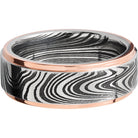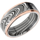 Handmade 8mm marble Damascus steel flat band with 14K rose gold grooved edges. This beautiful product isn't always in stock. Our online inventory shows everything that we produce and some products need to be made from scratch along with vendor items that we don't produce. We will call or email letting you know if the piece is available or needs to be built along with if the product needs to be sized. Current estimated build times are between 6-8 weeks.