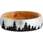 Cobalt chrome 7mm domed band featuring a laser-engraved tree pattern and a hardwood sleeve of Boxelder Burl. This beautiful product isn't always in stock. Our online inventory shows everything that we produce and some products need to be made from scratch along with vendor items that we don't produce. We will call or email letting you know if the piece is available or needs to be built along with if the product needs to be sized. Current estimated build times are between 6-8 weeks.