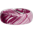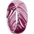 Woodgrain Damascus steel 8mm domed band beveled edges and pink Cerakote in the recessed pattern. This beautiful product isn't always in stock. Our online inventory shows everything that we produce and some products need to be made from scratch along with vendor items that we don't produce. We will call or email letting you know if the piece is available or needs to be built along with if the product needs to be sized. Current estimated build times are between 6-8 weeks.