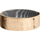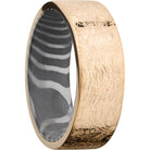 14K yellow gold 8mm band with a handmade tiger Damascus steel sleeve. This beautiful product isn't always in stock. Our online inventory shows everything that we produce and some products need to be made from scratch along with vendor items that we don't produce. We will call or email letting you know if the piece is available or needs to be built along with if the product needs to be sized. Current estimated build times are between 6-8 weeks.