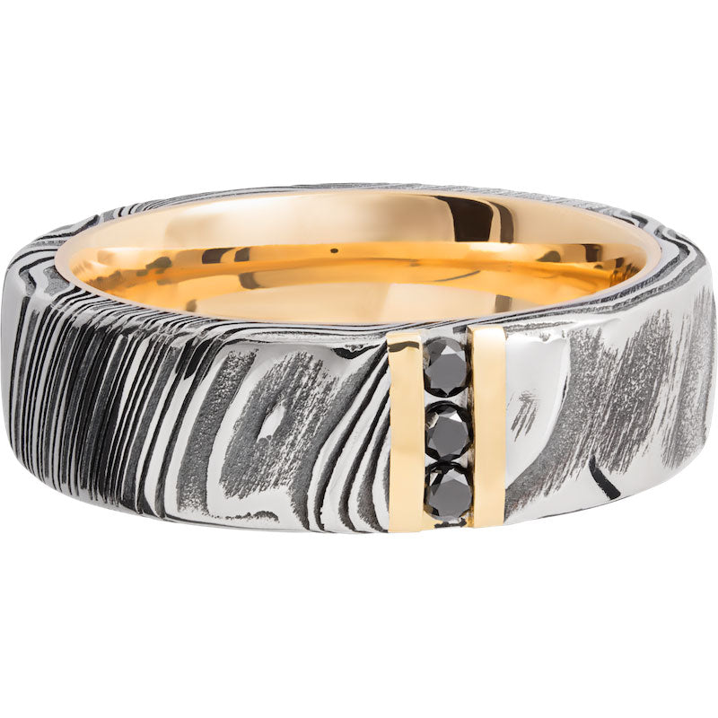 Handmade 7mm Woodgrain Damascus steel band featuring 3, .03ct channel-set black diamonds and a 14K yellow gold sleeve. This beautiful product isn't always in stock. Our online inventory shows everything that we produce and some products need to be made from scratch along with vendor items that we don't produce. We will call or email letting you know if the piece is available or needs to be built along with if the product needs to be sized. Current estimated build times are between 6-8 weeks.
