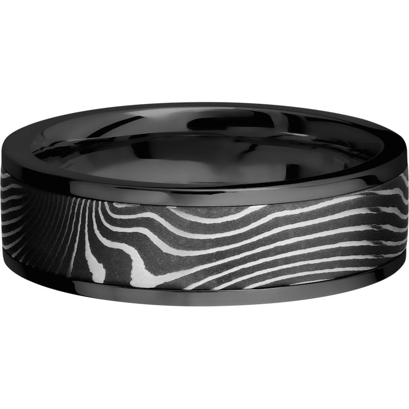 Zirconium flat 7mm band with a 5mm inlay of handmade flattwist Damascus steel. This beautiful product isn't always in stock. Our online inventory shows everything that we produce and some products need to be made from scratch along with vendor items that we don't produce. We will call or email letting you know if the piece is available or needs to be built along with if the product needs to be sized. Current estimated build times are between 6-8 weeks.