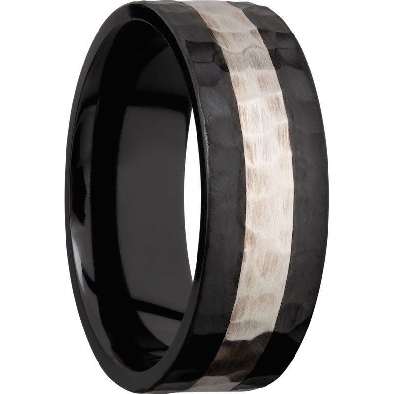 Zirconium 8mm flat band with an inlay of sterling silver. This beautiful product isn't always in stock. Our online inventory shows everything that we produce and some products need to be made from scratch along with vendor items that we don't produce. We will call or email letting you know if the piece is available or needs to be built along with if the product needs to be sized. Current estimated build times are between 6-8 weeks.