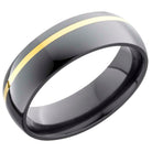 Zirconium 6mm domed band with an off center inlay of 14K yellow gold. This beautiful product isn't always in stock. Our online inventory shows everything that we produce and some products need to be made from scratch along with vendor items that we don't produce. We will call or email letting you know if the piece is available or needs to be built along with if the product needs to be sized. Current estimated build times are between 6-8 weeks.