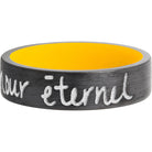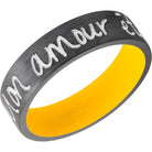 Zirconium 7mm flat band with slightly rounded edges and a laser-carved handwritten message with a yellow Cerakote sleeve. This beautiful product isn't always in stock. Our online inventory shows everything that we produce and some products need to be made from scratch along with vendor items that we don't produce. We will call or email letting you know if the piece is available or needs to be built along with if the product needs to be sized. Current estimated build times are between 6-8 weeks.