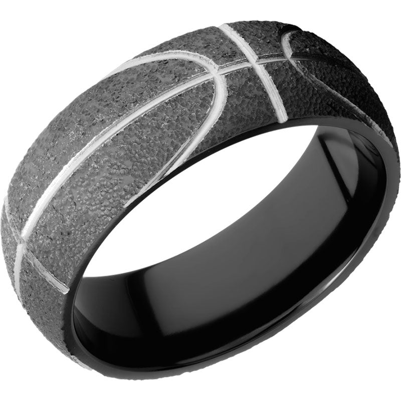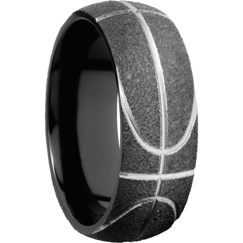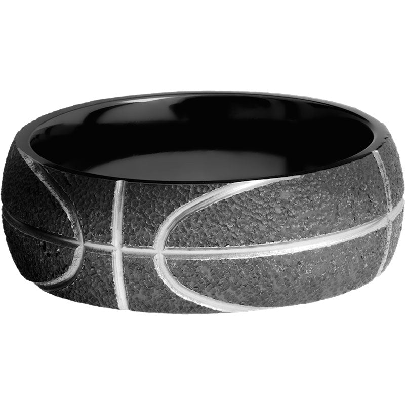 Zirconium 8mm domed band with a laser-carved basketball pattern. This beautiful product isn't always in stock. Our online inventory shows everything that we produce and some products need to be made from scratch along with vendor items that we don't produce. We will call or email letting you know if the piece is available or needs to be built along with if the product needs to be sized. Current estimated build times are between 6-8 weeks.
