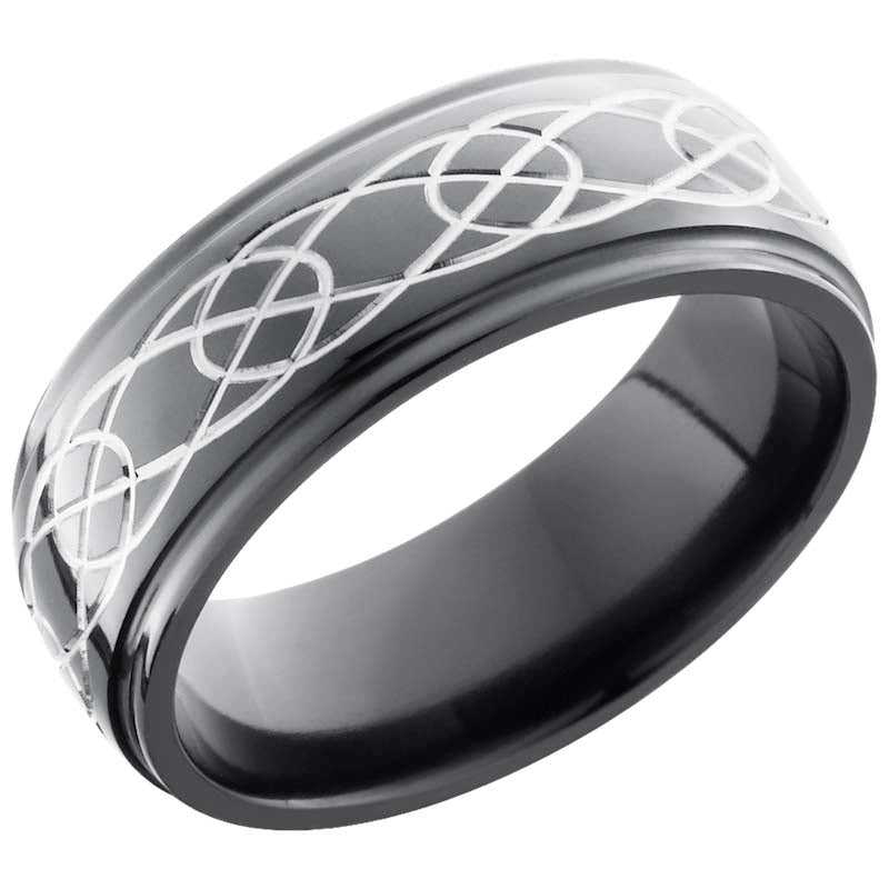 Zirconium 8mm domed band with grooved edges and a laser-carved celtic pattern. This beautiful product isn't always in stock. Our online inventory shows everything that we produce and some products need to be made from scratch along with vendor items that we don't produce. We will call or email letting you know if the piece is available or needs to be built along with if the product needs to be sized. Current estimated build times are between 6-8 weeks.