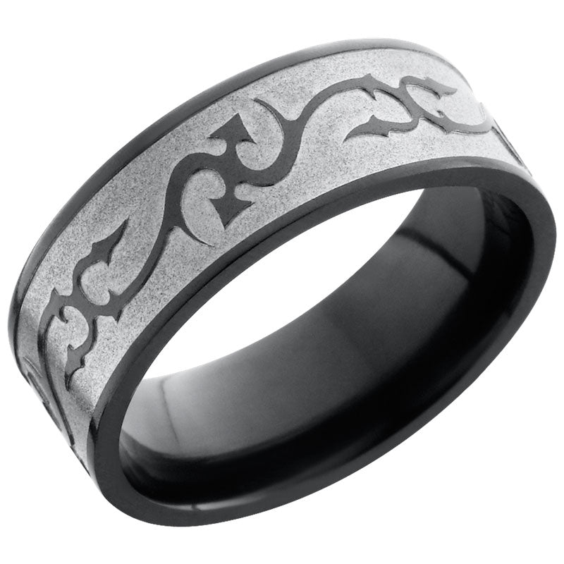 Zirconium 8mm flat band with a laser-carved thorn pattern. This beautiful product isn't always in stock. Our online inventory shows everything that we produce and some products need to be made from scratch along with vendor items that we don't produce. We will call or email letting you know if the piece is available or needs to be built along with if the product needs to be sized. Current estimated build times are between 6-8 weeks.