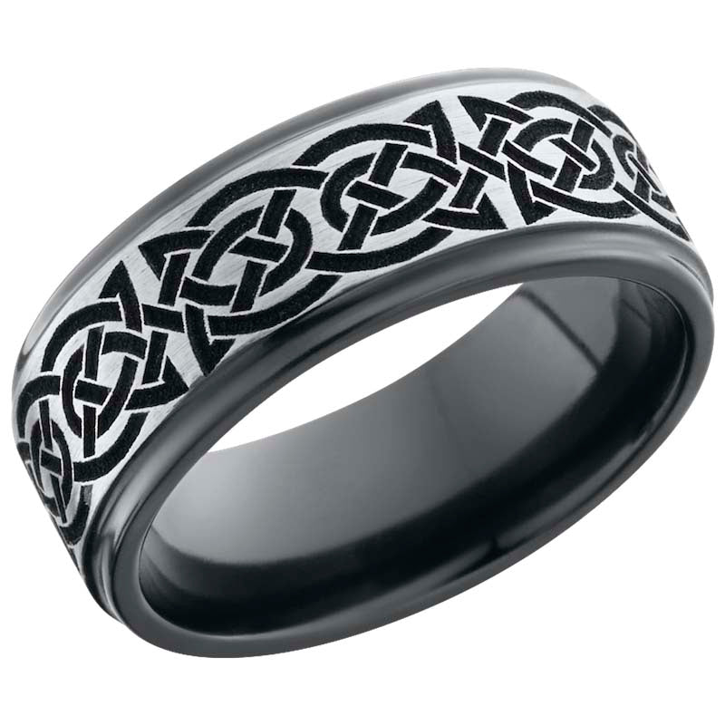 Zirconium 8mm flat band with a laser-carved celtic pattern. This beautiful product isn't always in stock. Our online inventory shows everything that we produce and some products need to be made from scratch along with vendor items that we don't produce. We will call or email letting you know if the piece is available or needs to be built along with if the product needs to be sized. Current estimated build times are between 6-8 weeks.