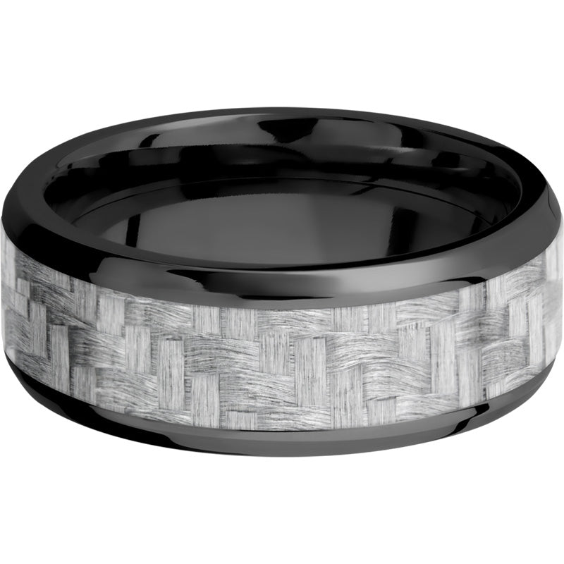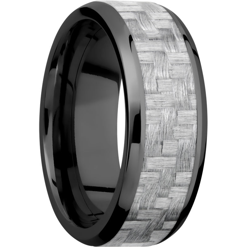 Zirconium 8mm beveled band with a 5mm inlay of silver Carbon Fiber. This beautiful product isn't always in stock. Our online inventory shows everything that we produce and some products need to be made from scratch along with vendor items that we don't produce. We will call or email letting you know if the piece is available or needs to be built along with if the product needs to be sized. Current estimated build times are between 6-8 weeks.