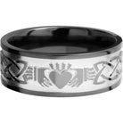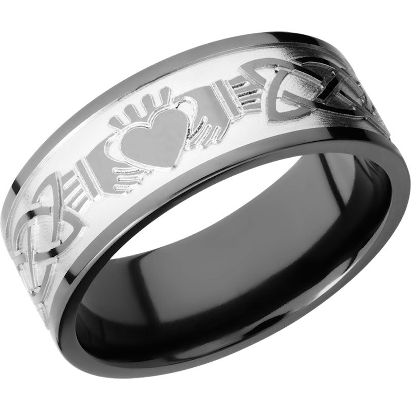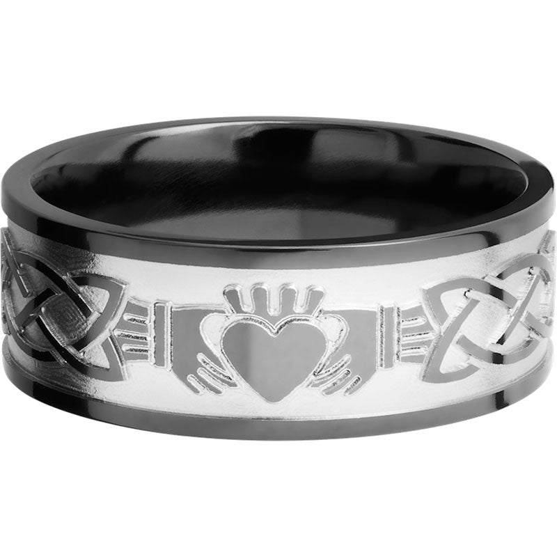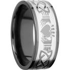 Zirconium 9mm flat band with a laser-carved claddagh celtic pattern. This beautiful product isn't always in stock. Our online inventory shows everything that we produce and some products need to be made from scratch along with vendor items that we don't produce. We will call or email letting you know if the piece is available or needs to be built along with if the product needs to be sized. Current estimated build times are between 6-8 weeks.