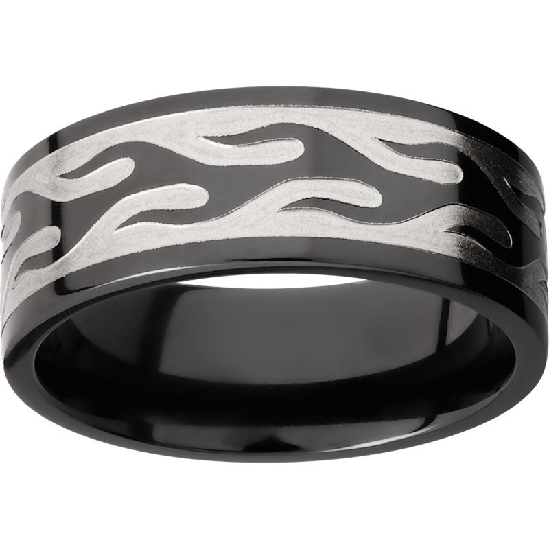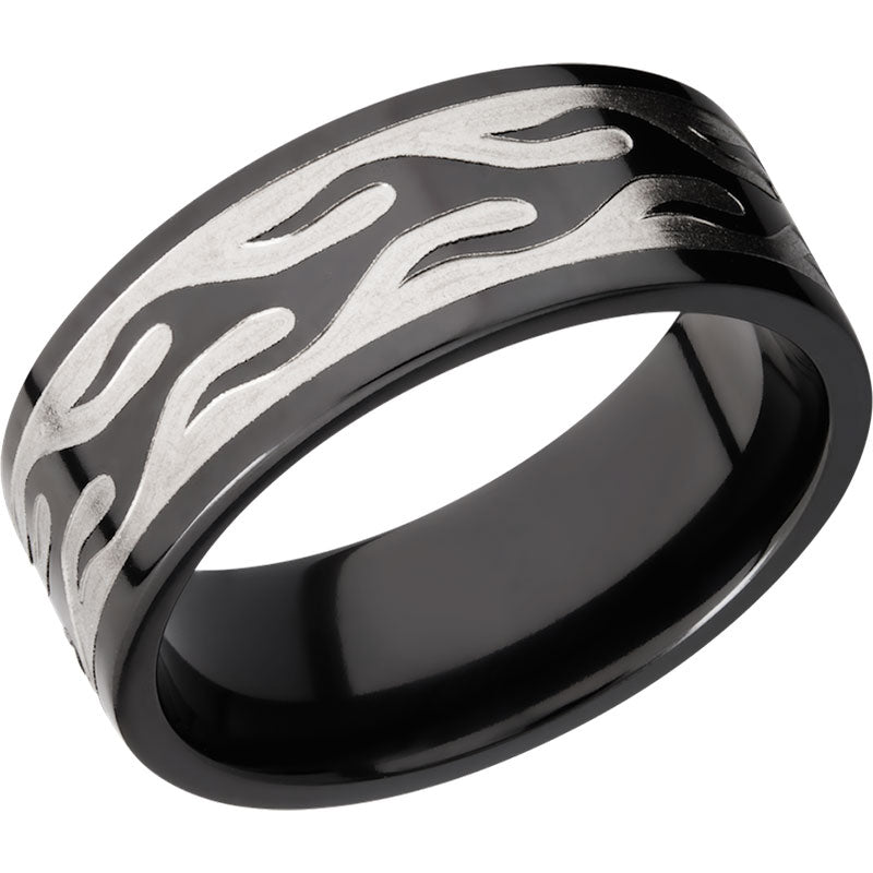 Zirconium 9mm flat band with a laser-carved contour flame pattern. This beautiful product isn't always in stock. Our online inventory shows everything that we produce and some products need to be made from scratch along with vendor items that we don't produce. We will call or email letting you know if the piece is available or needs to be built along with if the product needs to be sized. Current estimated build times are between 6-8 weeks.