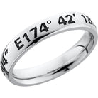 Cobalt chrome 4mm domed band with a laser-carved coordinates. This beautiful product isn't always in stock. Our online inventory shows everything that we produce and some products need to be made from scratch along with vendor items that we don't produce. We will call or email letting you know if the piece is available or needs to be built along with if the product needs to be sized. Current estimated build times are between 6-8 weeks.