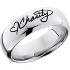 Cobalt chrome 8mm domed band with a laser-carved handwritten message. This beautiful product isn't always in stock. Our online inventory shows everything that we produce and some products need to be made from scratch along with vendor items that we don't produce. We will call or email letting you know if the piece is available or needs to be built along with if the product needs to be sized. Current estimated build times are between 6-8 weeks.