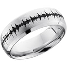 Cobalt chrome 8mm domed band with a laser-carved soundwave. This beautiful product isn't always in stock. Our online inventory shows everything that we produce and some products need to be made from scratch along with vendor items that we don't produce. We will call or email letting you know if the piece is available or needs to be built along with if the product needs to be sized. Current estimated build times are between 6-8 weeks.