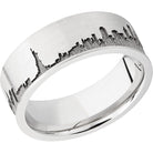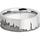 Cobalt chrome 8mm flat band with laser-carved New York skyline. This beautiful product isn't always in stock. Our online inventory shows everything that we produce and some products need to be made from scratch along with vendor items that we don't produce. We will call or email letting you know if the piece is available or needs to be built along with if the product needs to be sized. Current estimated build times are between 6-8 weeks.
