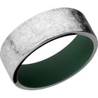 Cobalt chrome 8mm flat band with slightly rounded edges and a Highland Green Cerakote sleeve. This beautiful product isn't always in stock. Our online inventory shows everything that we produce and some products need to be made from scratch along with vendor items that we don't produce. We will call or email letting you know if the piece is available or needs to be built along with if the product needs to be sized. Current estimated build times are between 6-8 weeks.