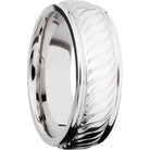 Cobalt chrome 8mm flat band with rounded edges and a laser-carved twist pattern. This beautiful product isn't always in stock. Our online inventory shows everything that we produce and some products need to be made from scratch along with vendor items that we don't produce. We will call or email letting you know if the piece is available or needs to be built along with if the product needs to be sized. Current estimated build times are between 6-8 weeks.