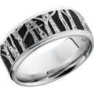 Cobalt chrome 9mm flat band with grooved edges featuring a laser-carved aspen treeline pattern. This beautiful product isn't always in stock. Our online inventory shows everything that we produce and some products need to be made from scratch along with vendor items that we don't produce. We will call or email letting you know if the piece is available or needs to be built along with if the product needs to be sized. Current estimated build times are between 6-8 weeks.