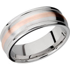 Cobalt chrome 8mm domed band with rounded edges and 14K rose gold inlays in reverse milgrain. This beautiful product isn't always in stock. Our online inventory shows everything that we produce and some products need to be made from scratch along with vendor items that we don't produce. We will call or email letting you know if the piece is available or needs to be built along with if the product needs to be sized. Current estimated build times are between 6-8 weeks.