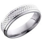 Titanium 6mm flat band with grooved edges and a laser-carved tight weave pattern. This beautiful product isn't always in stock. Our online inventory shows everything that we produce and some products need to be made from scratch along with vendor items that we don't produce. We will call or email letting you know if the piece is available or needs to be built along with if the product needs to be sized. Current estimated build times are between 6-8 weeks.