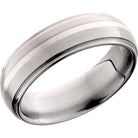 Titanium 7mm domed band with grooved edges and an inlay of sterling silver. This beautiful product isn't always in stock. Our online inventory shows everything that we produce and some products need to be made from scratch along with vendor items that we don't produce. We will call or email letting you know if the piece is available or needs to be built along with if the product needs to be sized. Current estimated build times are between 6-8 weeks.