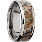 Titanium 8mm beveled band with a 5mm inlay Real Tree AP Camo. This beautiful product isn't always in stock. Our online inventory shows everything that we produce and some products need to be made from scratch along with vendor items that we don't produce. We will call or email letting you know if the piece is available or needs to be built along with if the product needs to be sized. Current estimated build times are between 6-8 weeks.