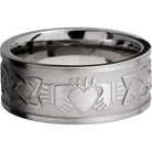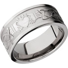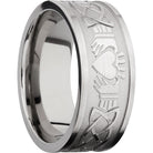 Titanium 9mm flat band with a laser-carved claddagh celtic pattern. This beautiful product isn't always in stock. Our online inventory shows everything that we produce and some products need to be made from scratch along with vendor items that we don't produce. We will call or email letting you know if the piece is available or needs to be built along with if the product needs to be sized. Current estimated build times are between 6-8 weeks.