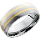 Titanium 8mm domed band with 2, 1mm inlays of 14K yellow gold. This beautiful product isn't always in stock. Our online inventory shows everything that we produce and some products need to be made from scratch along with vendor items that we don't produce. We will call or email letting you know if the piece is available or needs to be built along with if the product needs to be sized. Current estimated build times are between 6-8 weeks.