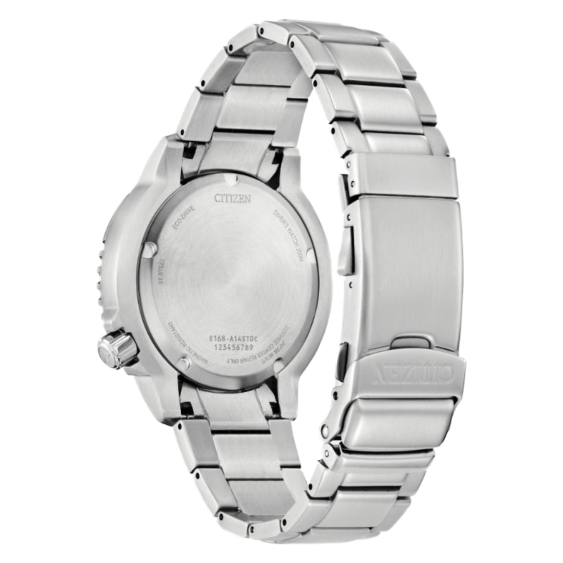 Submerge yourself in the latest Dive watch to join Citizen's innovative Promaster line. The robust 44mm silver-tone stainless steel exterior has an easy-grip dive bezel and crown at 4 o'clock, with the monochromatic design secured to the wrist via a matching silver-tone stainless steel bracelet. The sunray-textured, light blue dial features oversized hands and applied markers that add to its high legibility, while accents of a bright luminous material ensure high legibility to even the deepest depths. At the 4 o'clock position is a thoughtful date window, adding another element of functionality to this built-tough diver. Maintaining the robust standards of the Promaster Collection, the timepiece is water resistant up to 200 meters. Powered by Citizen's proprietary Eco-Drive technology to provide light-powered vitality continuously and sustainably without ever needing a battery. Caliber E168.