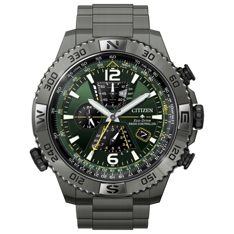The newly re-launched Promaster Navihawk men's watch from Citizen is inspired by the elements a pilot experiences while in flight. The grey stainless steel watch case and bracelet band have the look of stormy clouds, while the black dial is accented with bold green highlights. In addition to Eco-Drive technology - it is sustainably powered by light - the watch has a wide range of features, including a chronograph, atomic timekeeping, 12/24-hour time, and a power reserve indicator. This is the ultimate watch for anyone who isn't content to keep their feet on the ground and always wants to see what's over the next horizon.