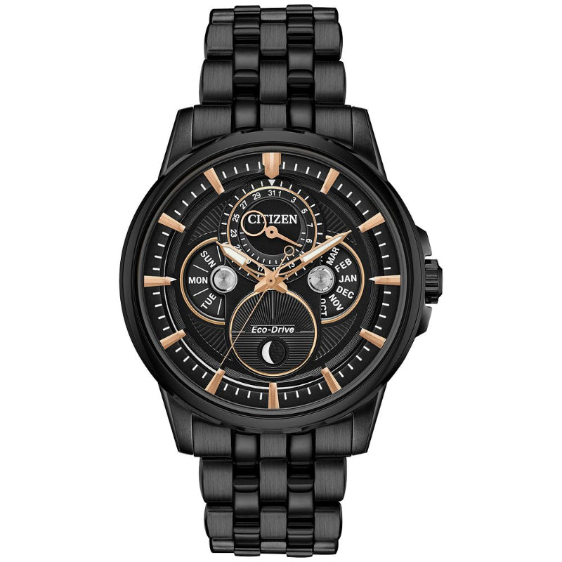 Bring sophistication to your day with the new CITIZEN Calendrier Moonphase, powered by any light with Eco-Drive. This timeless watch features analog month/day/date. Men's watch featured with black ion plated stainless steel case and bracelet with black dial. Featuring our Eco-Drive technology - powered by light, any light. Never needs a battery. Caliber number 8730.