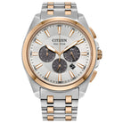 Make a distinctive style statement with the new Citizen men's dress watch from the Classic collection. The two-tone stainless steel case holds the silver-tone dial with a 1/5 second chronograph that measures up to 60 minutes, 12/24-hour, time and date. The sleek dial is finished with a sapphire crystal. The two-tone stainless steel bracelet band has a fold over clasp with push buttons, giving the timepiece an understated refinement. This Eco-Drive watch is powered by any light source, eliminating the need for batteries, and is water resistant up to 100 meters. This professional-looking timepiece provides the wearer with lasting style and top performance.