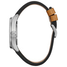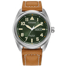 Rekindle the past with this vintage-inspired men's watch by Citizen. Paying homage to the golden age of travel, this timepiece features a green dial with a rich caramel brown leather strap with contrast stitching. This retro-styled men's watch features a Super Titanium stainless steel case and classic date function. This timepiece also features Citizen's sustainable Eco-Drive technology, powering the watch by light. For those with discriminating taste, the Garrison delivers every time.