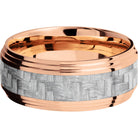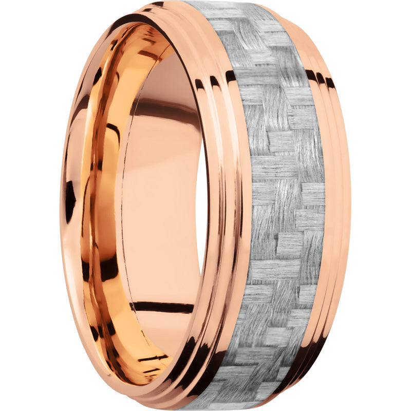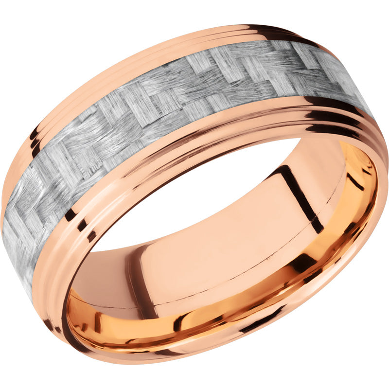 14K Rose Gold 9mm flat band with 2 grooved edges and a 4mm inlay of silver Carbon Fiber. This beautiful product isn't always in stock. Our online inventory shows everything that we produce and some products need to be made from scratch along with vendor items that we don't produce. We will call or email letting you know if the piece is available or needs to be built along with if the product needs to be sized. Current estimated build times are between 6-8 weeks.