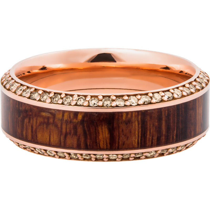 14k Rose Gold 8.5mm beveled band with an inlay of exotic Natcoco hardwood and eternity chocolate diamond accents. This beautiful product isn't always in stock. Our online inventory shows everything that we produce and some products need to be made from scratch along with vendor items that we don't produce. We will call or email letting you know if the piece is available or needs to be built along with if the product needs to be sized. Current estimated build times are between 6-8 weeks.