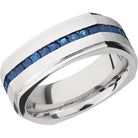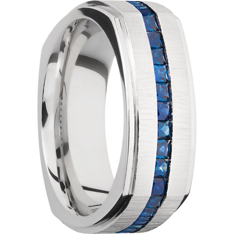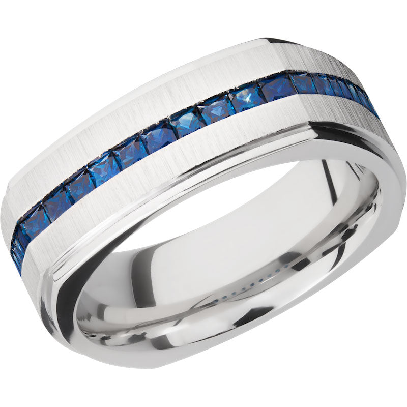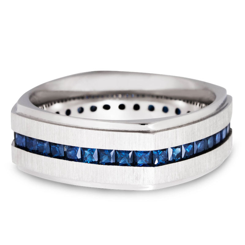 14K White gold 8mm flat square band with grooved edges and eternity-set sapphires. This beautiful product isn't always in stock. Our online inventory shows everything that we produce and some products need to be made from scratch along with vendor items that we don't produce. We will call or email letting you know if the piece is available or needs to be built along with if the product needs to be sized. Current estimated build times are between 6-8 weeks.