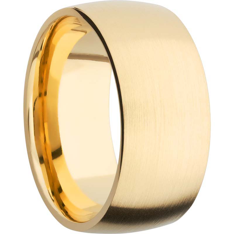 14K Yellow gold 10mm domed band. This beautiful product isn't always in stock. Our online inventory shows everything that we produce and some products need to be made from scratch along with vendor items that we don't produce. We will call or email letting you know if the piece is available or needs to be built along with if the product needs to be sized. Current estimated build times are between 6-8 weeks.