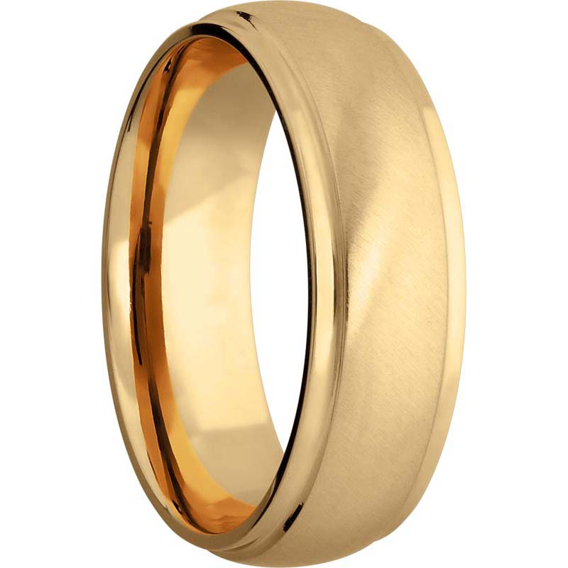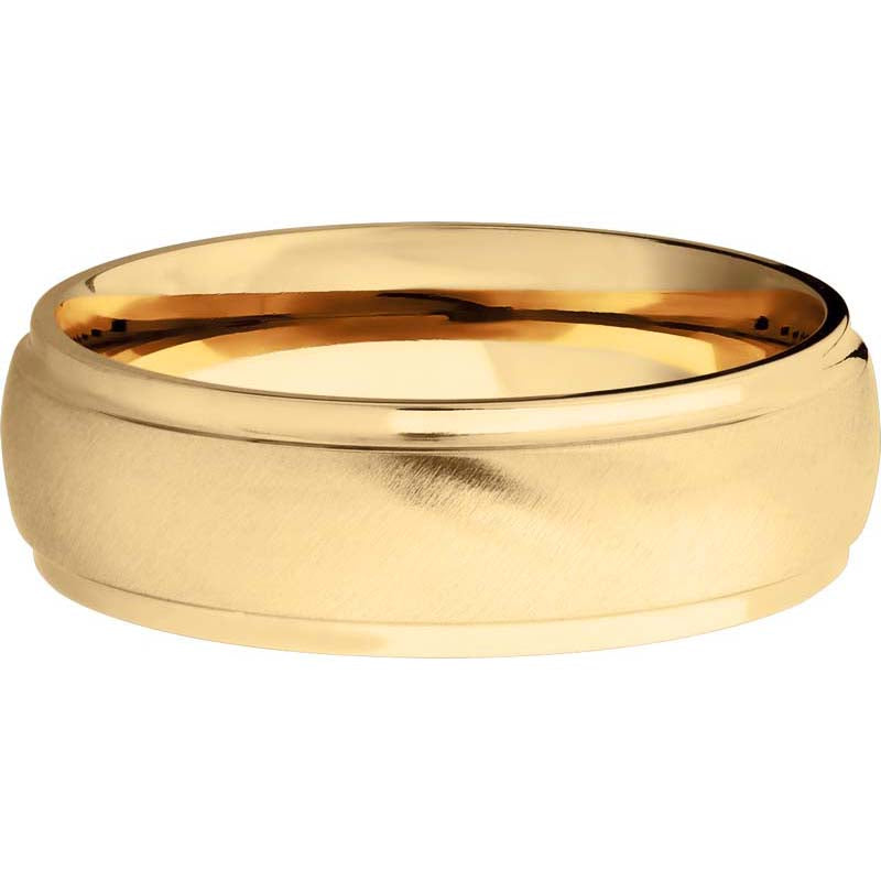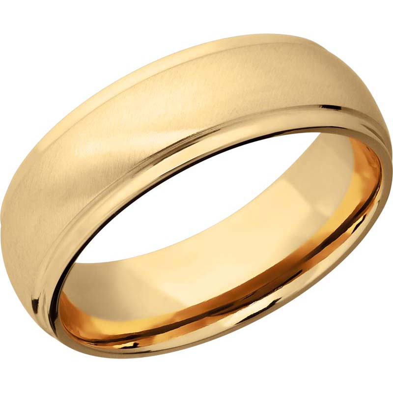 14K Yellow gold 7mm domed band with grooved edges. This beautiful product isn't always in stock. Our online inventory shows everything that we produce and some products need to be made from scratch along with vendor items that we don't produce. We will call or email letting you know if the piece is available or needs to be built along with if the product needs to be sized. Current estimated build times are between 6-8 weeks.